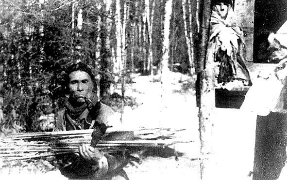 Иван Гаврилович Езин держит в руках стрелы, которыми манси добывали лосей, когда ставили самострелы в загородках. (фото В.В.Раевского, 1940г)