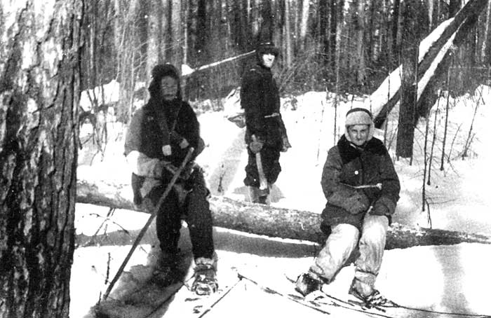Е.В.Дорогостайская (сидит справа), В.В.Раевский (стоит в центре) и К.В.Гарновский в зимнем походе.